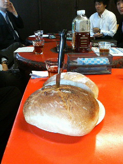 最初に巨大パンが出てきて、ナイフで切ってみんなで取り分けて食べます!