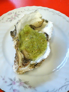 その次は、1人一個の殻付で牡蠣のバジルソースのオーブン焼きが出てきました。
